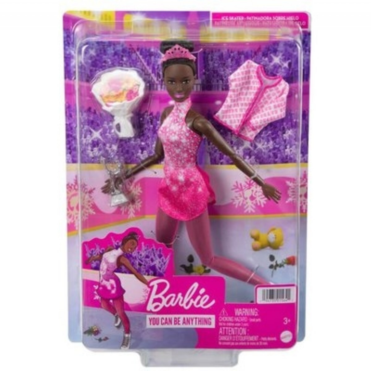 30 cm boyundaki Barbie, pembe renkli profesyonel buz pateni elbisesi ve ceket giyiyor, elinde ise gül buketi ile şampiyonluk ödülü tutuyor.