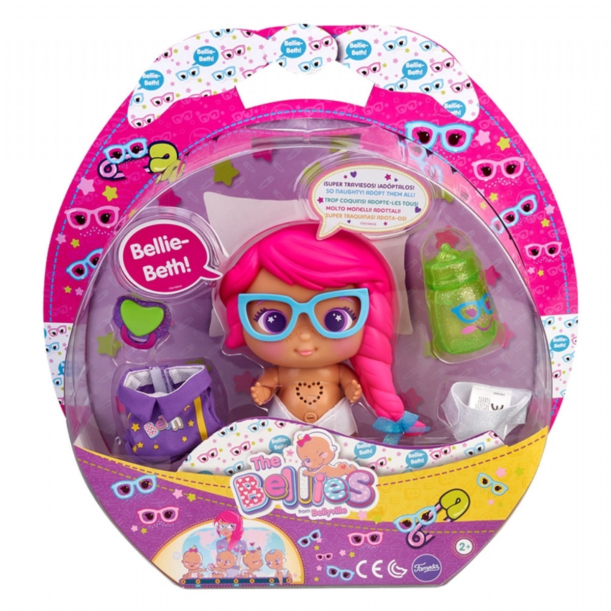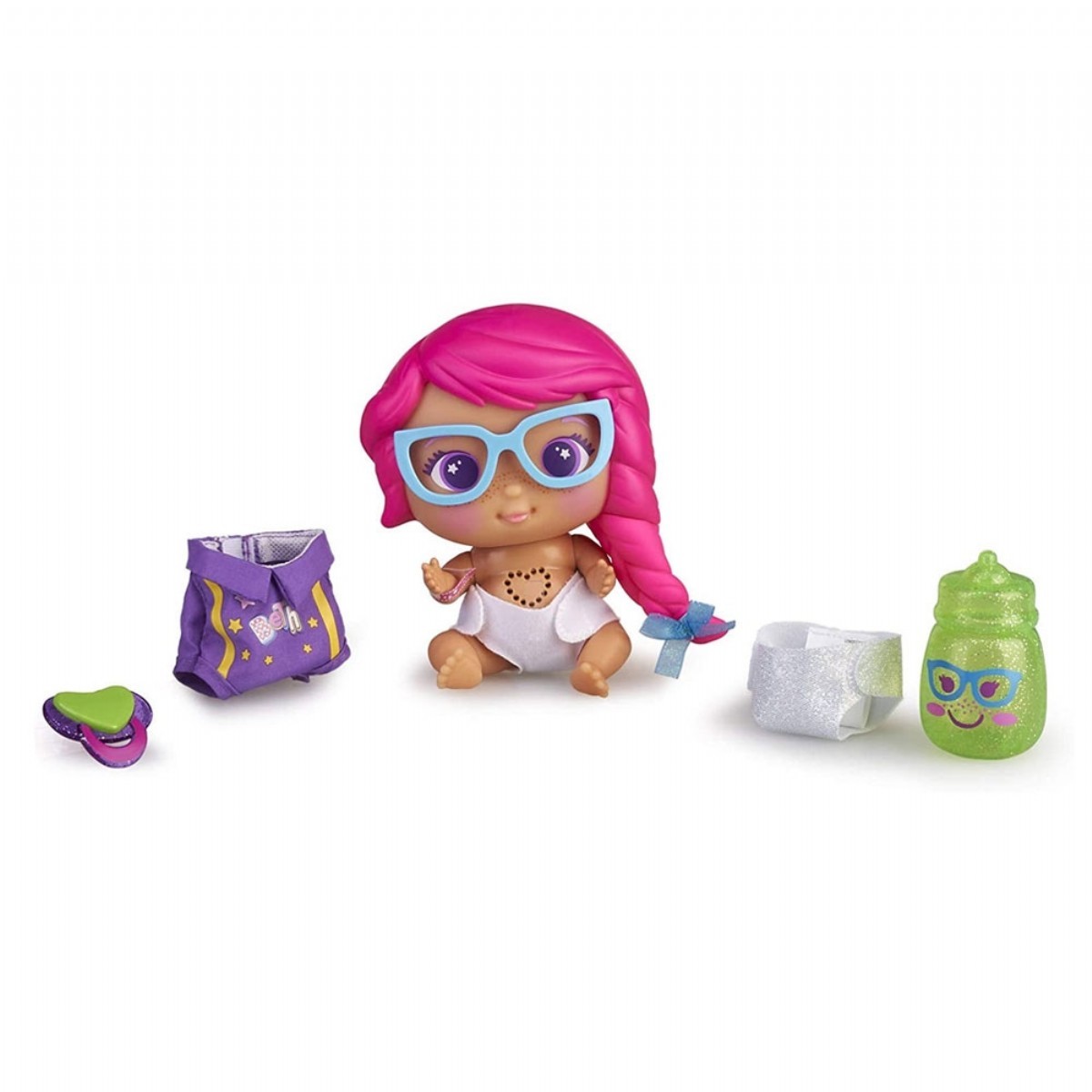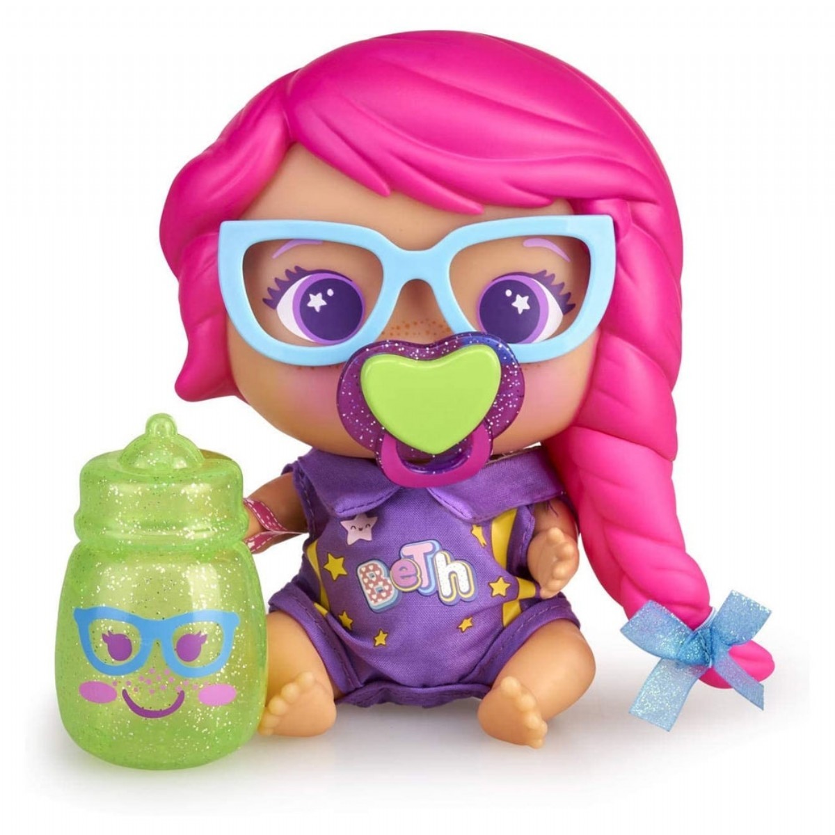 Tıpkı Beth’inki gibi bu bebeğin de mor renkli tulumu, mavi çerçeveli gözlüğü ve pembe örgülü saçı var!