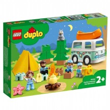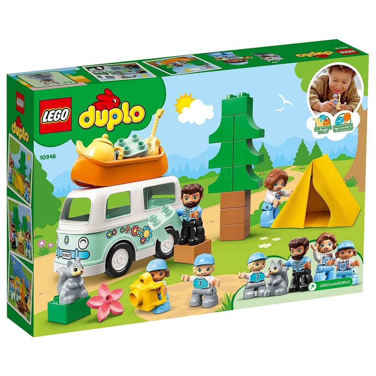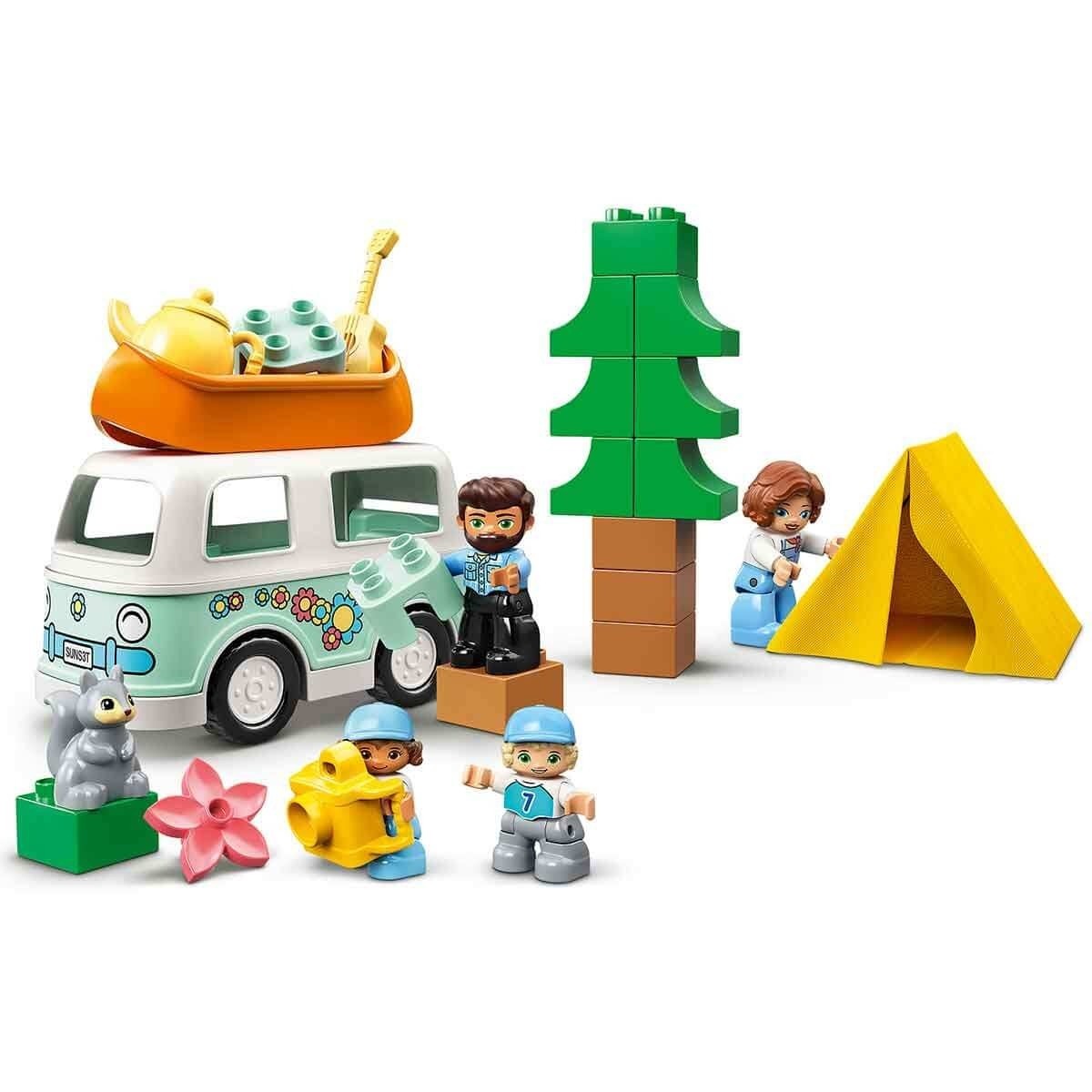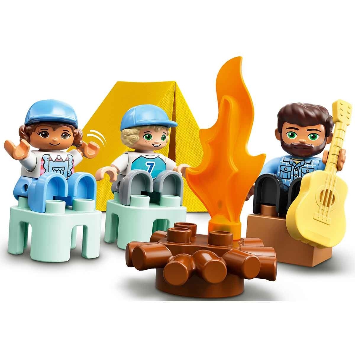 Bir erkek, bir kadın, bir kız ve bir erkek çocuk olmak üzere 4 DUPLO figürü, tekerlekleri dönen ve tavanı çıkarılabilen bir karavan, kumaş çadır ve eğlenceli aksesuarlar içerir.