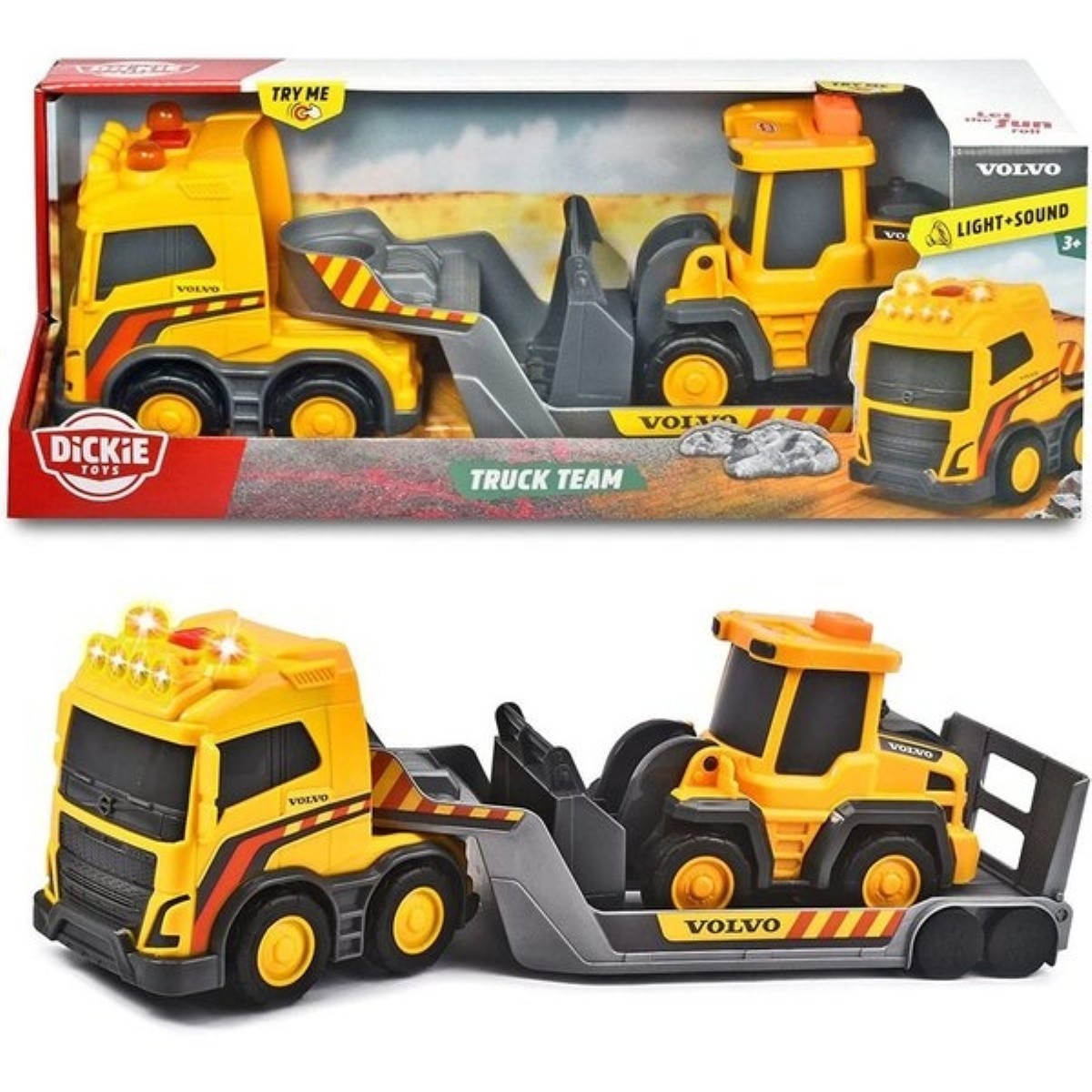 Dickie Toys Volvo Römorklu Kamyon 32 cm uzunluğundadır Set içerisinde 9 cm uzunluğunda Volvo Tekerlekli Yükleyici yer almaktadır