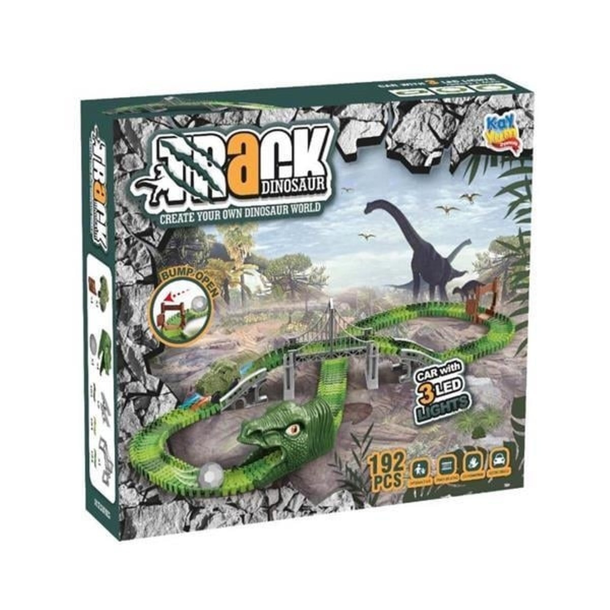 Bu oyun seti ile oynamak cesaret ister! Büyük küçük herkesin ilgisini üzerine toplayan Dinosaur Tracks Oyun Seti, dinozorları ve kendin yap oyuncaklarını seven tüm çocukların en sevdiği oyuncak olmak için geliyor. Birleştirilebilir 192 parçadan oluşan raylar, bükülebilir, döndürülebilir ve hareket ettirilebilir. Set içerisinde bulunan dinozor arabayı çocuklar rayların üzerinde sürebilir, köprüden hatta kovboy kapısından geçerek oyunlarını daha da eğlenceli bir hale getirebilirler. Araba 3 renkli ışıklı yapısı ile eğlenceyi katlıyor! Raylara yerleştirebilecekleri dinozor tüneli ise ışıklı dinozor araba ile oynamaya doyamayacakları bir detay. 1 adet kaya topu da çocukların oluşturacakları hikâyelere zenginlik katacaktır. Her şey onların hayal gücüne bağlı! Rengi, tasarımı ve set içerisindeki aksesuarları ile yılan detaylarına sahip bu oyun seti sayesinde çocuklar bir yandan hayal gücünü geliştirirken bir yandan da ince motor becerilerini geliştirme fırsatı bulacaktır. Çocukların oyunlar oynarken oluşturacakları hikayeler aracılığıyla yaratıcılıklarına katkı sağlar. Ayrıca arkadaşlarıyla birlikte oynayacakları oyunlar sosyalleşmelerine yardımcı olur. Kutu içerisinde; 1 adet dinozor araba, 1 adet köprü, 1 adet kovboy kapısı, 1 adet dinozor tüneli, 1 adet kaya top ve 192 adet ray parçası bulunmaktadır. Ürün; 1 x 1,5V AA pil ile çalışmaktadır. Pil, kutuya dahil değildir. Kutu ölçüsü: 32 x 36 x 7 cm