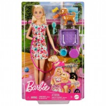 Sette bir yavru köpek ve tekerlekleri dönen, yürüteç kullanan bir büyük köpek bulunur. Bu minik dostlar Barbie ile yürüyüşe çıkmaya bayılıyor. Çocuklar, bol sevgiye ve ekstra ilgiye ihtiyacı olan köpekçiğin yürütecini çıkarıp takabilir. Mama kabı, tasmalar, evcil hayvan yatağı ve ellerine tam oturan tasma kayışı ile Barbie, sevimli dostlarına bakmak için ihtiyacı olan her şeye sahiptir.