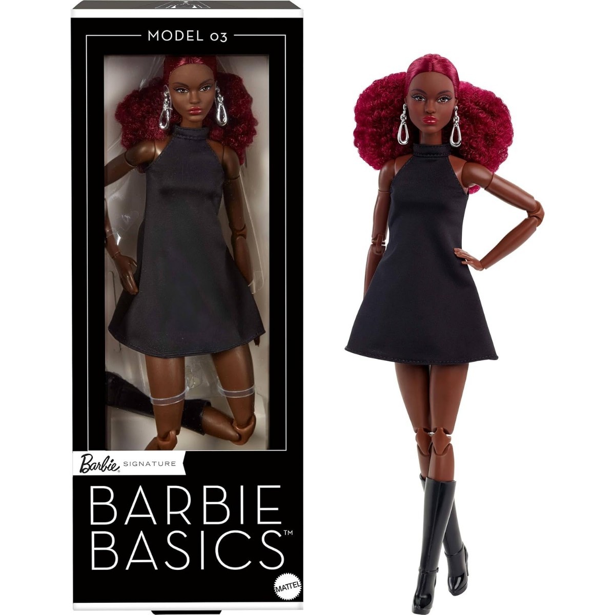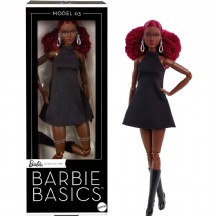 Barbie Basics Model 03 bebek, klasik botlarla eşleştirilmiş akıcı balıkçı yaka LBD'de sofistike bir görünüm yaratır. Kırmızı bukleleri zarif, gümüşi gözyaşı çemberlerini göstermek için yarı yukarıya yarı aşağı.