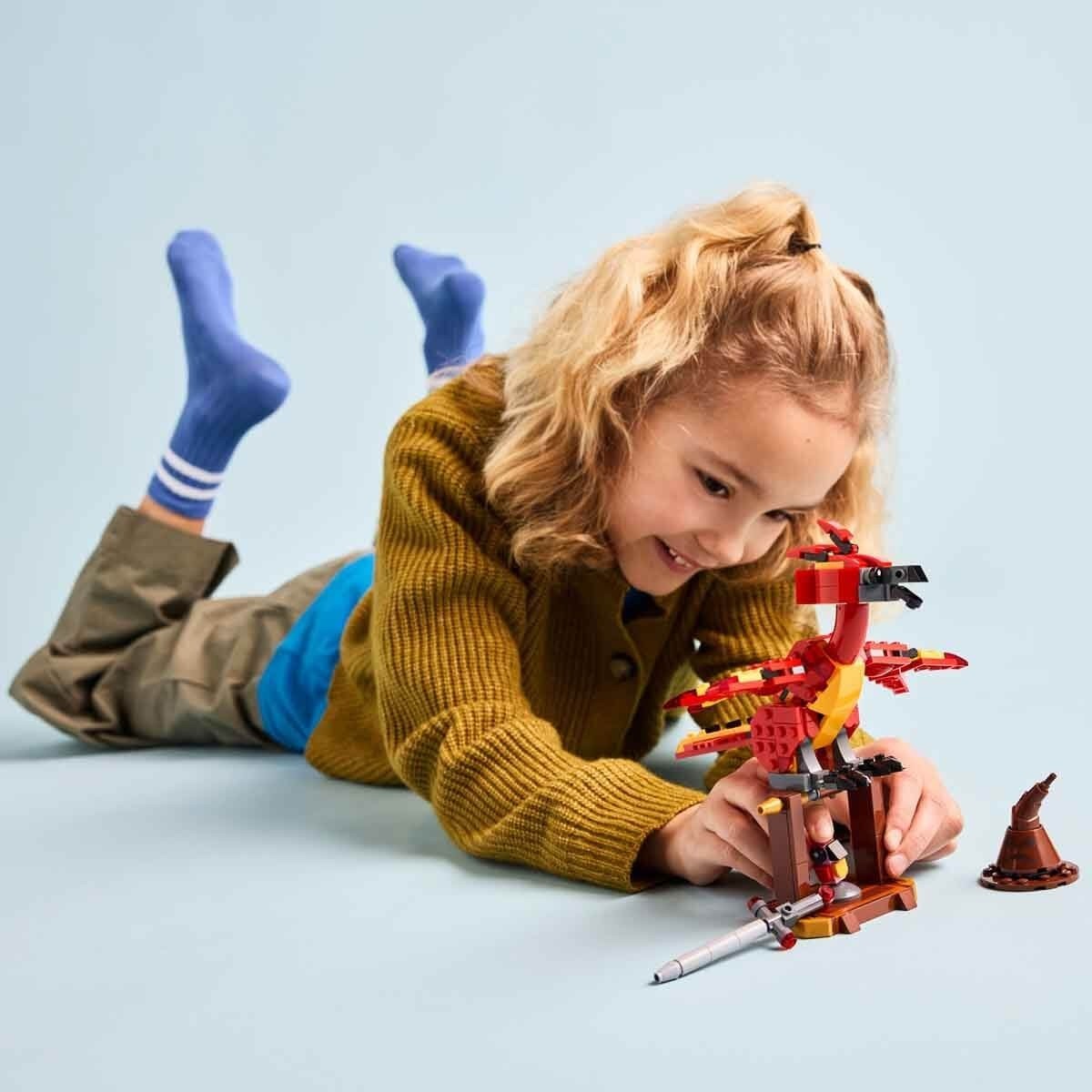 Bir ödülü hak eden 8 yaş ve üzeri kız ve erkek çocuklarla hayranlar için büyücü hediyesi olan ikonik aksesuarlı bu mitolojik yaratık oyuncak figürü (ayrıca şirin bir yavru Fawkes figürü), yaratıcı oyunlar oynamak ve sergilenmek için yapıldı. Modeller, diğer koleksiyonluk LEGO Harry Potter setleriyle (ayrı satılır) birlikte kullanılarak çocuklara daha da fazla oyun olanağı verilebilir. Çocukların modelleri 3 boyutlu yakınlaştırıp döndürebileceği, ilerlemelerini takip edebileceği ve setleri kaydedebileceği LEGO Builder uygulamasıyla yapım deneyimini ekstra eğlenceli hale getirin.