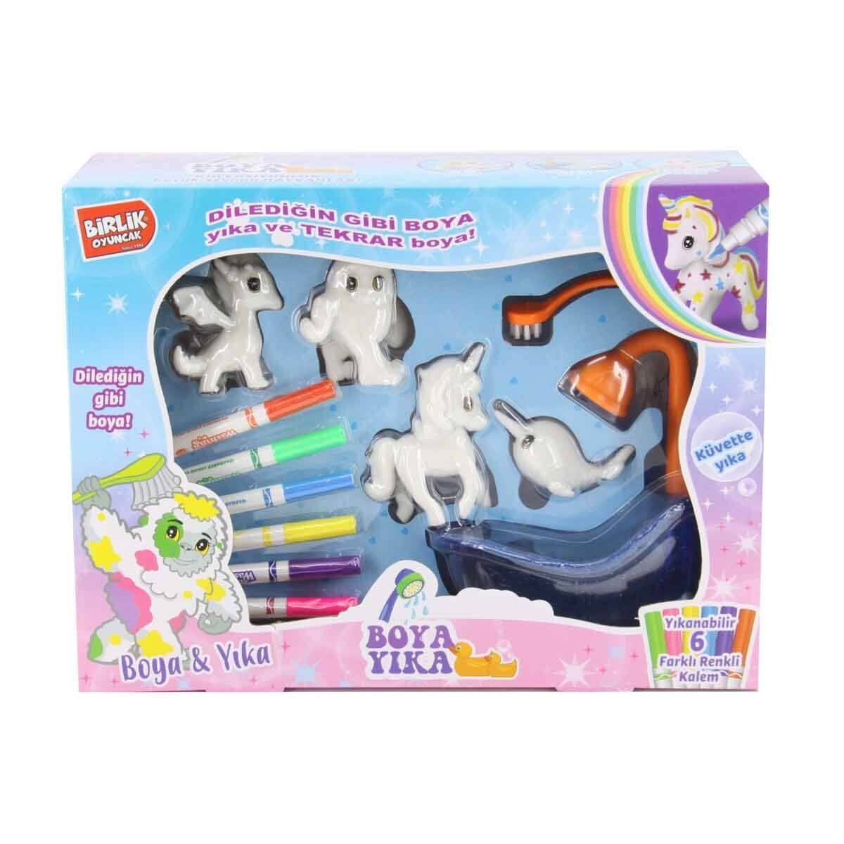 6 farklı renkli yıkanabilir kalemler ile Unicornların gökkuşağı renginde boyayabileceksin.