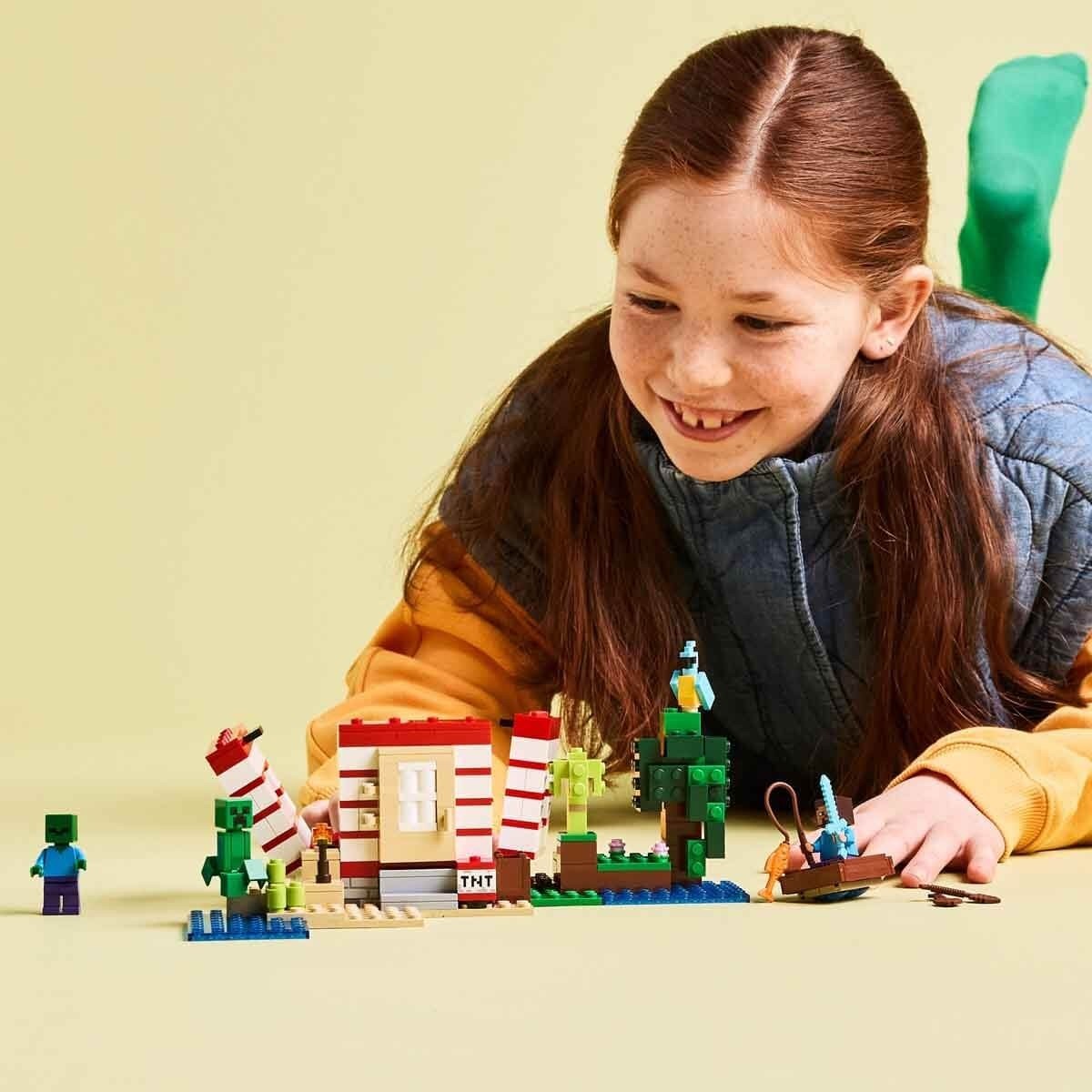 İnşa edilebilen ev, Minecraft orman biyomunda yer alır ve oyunun ikonik TNT öğesinin büyük ölçekli bir versiyonu gibi görünür. Çocuklar, yan taraftaki anahtarla tüm evi çökerten bir TNT patlatma fonksiyonunu tetikleyebilir. Ortalık yatıştığında, çocuklar evi yeniden inşa ederek bir sonraki maceralarına hazır hale getirebilir. Steve, Creeper ve zombi mini figürleri, hayal gücüne dayalı oyunları ve savaş aksiyonunu teşvik eder. Tekne, olta, balık, papağan ve orman yeşillikleri gibi orijinal LEGO Minecraft aksesuarları içerir. LEGO Builder uygulaması, çocuklara cihazlarını kullanarak modelleri 3 boyutlu yakınlaştırma ve döndürme eğlencesi sunar. 287 parça içerir.
